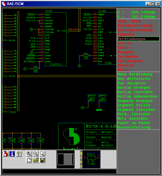 BAE-Seitenmenü-BenutzeroberflächeDas rechte Menü der BAE-Seitenmenü-Benutzeroberfläche ist immer in zwei Hälften unterteilt, wobei Sie zum Start einer Funktion immer beide Hälften anwählen können. In der oberen Hälfte befindet sich das Hauptmenü mit den Menüpunkten zur Auswahl des in der unteren Hälfte angezeigten Menüs. Dadurch erreichen Sie alle Funktionen des selben Arbeitsgangs mit nur einer und alle anderen mit maximal zwei Maustastenbetätigungen. In den Menüfeldern der BAE-Standard-Benutzeroberfläche befindet sich ein grüner Balken, der durch Bewegen der Maus verschoben werden kann. Durch Betätigen der linken oder rechten Maustaste wird der entsprechende Menüpunkt angewählt. Wenn Sie zum Beispiel im Layouteditor die Funktion erreichen wollen, so wählen Sie zunächst den Menüpunkt im Hauptmenü und danach die nunmehr im Menü erscheinende Funktion an. Nach Beendigung dieser Funktion können Sie diese durch Drücken der rechten oder linken Maustaste erneut aktivieren oder z.B. die im gleichen Menü befindliche Funktion direkt anwählen. Ein Wechsel zu der Funktion bedarf aus diesem Menü heraus nur der Anwahl der Punkte im Hauptmenü und dann direkt der Funktion im Menü . Nach Anwahl einer Funktion erscheint entweder ein weiteres Menü, die Aufforderung zu einer Eingabe in der Eingabe- und Mitteilungszeile, oder aber ein Fadenkreuz im eigentlichen Grafikarbeitsbereich. In der Statuszeile werden ggf. Hilfsinformationen oder Prompts zur angewählten Funktion eingeblendet. Funktionsspezifische Eingabeaufforderungen (z.B. für Koordinaten- und Längen- und Breitenangaben) und Fehlermeldungen enthalten soweit vorhanden den Namen des betroffenen bzw. bearbeiteten Elements. Bei Eingaben über den Grafikkursor erscheint in der Mitteilungszeile ein Hinweis zu der erwarteten Eingabe. Der Menübalken wird üblicherweise rot dargestellt, wenn das System auf Benutzereingaben wartet. Die mittlere Maustaste hat eine Sonderfunktion; mit ihr können Sie jederzeit, d.h. auch aus beliebigen Funktionen heraus ein besonderes Untermenü mit häufig benötigten Funktionen zur Änderung der Bilddarstellung anwählen. Durch Betätigung der mittleren Maustaste wird in der Mitteilungszeile der aktuelle Datei- und Elementname angezeigt, sofern nicht gerade eine andere Menüfunktion aktiv ist. Die Betätigung der mittleren Maustaste lässt sich auch durch simultanes Drücken der linken und der rechten Maustaste simulieren. Somit kann das Online-Bilddarstellungsmenü auch jederzeit aktiviert werden, wenn nur eine Zweitasten-Maus installiert bzw. konfiguriert ist. Durch Betätigen der ESC-Taste (ASCII-Code 27) kann die aktuell aktive Menüfunktion jederzeit abgebrochen werden (Abort Hotkey). Eine ganze Reihe von Funktionen erlauben wahlweise die mausgesteuerte Selektion der auszuführenden Funktion bzw. des zu bearbeitenden Elements über Popupmenüs. Dadurch vereinfacht sich die Bedienung elementarer Datenverwaltungsfunktionen wie , , , , usw. ganz erheblich. Grundsätzlich ist parallel zur Popupmenüauswahl jeweils auch immer die manuelle Eingabe des Elementnamens über die Mitteilungszeile möglich. Auch enthält jedes Popupmenü nach Bedarf spezielle Buttons wie (zum Abbrechen der Funktion), (zum Weiterblättern in der Menüauswahl) oder (zum Zurückblättern in der Menüauswahl). In den Dialogen bzw. Popupmenüs zur Auswahl von Bauteil- und Netznamen aus der Netzliste kann durch Eingabe von