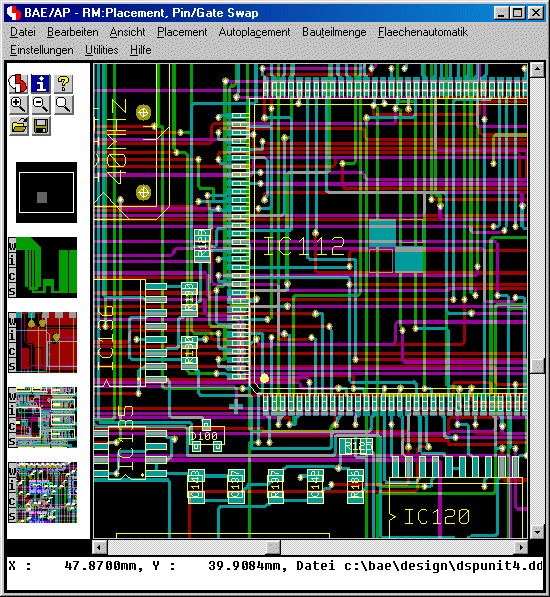 Die Farbdarstellung der BAE-Seitenmenü-Benutzeroberfläche kann mit Hilfe des Utilityprogramms bsetup an die anwenderspezifischen Bedürfnisse angepasst werden. Durch eine geeignete Einstellung der Menüfarben lässt sich u.U. ein nicht zu unterschätzender ergonomischer Vorteil erzielen (Erkennung des aktiven Menüs bzw. der aktiven Funktion aus dem Augenwinkel). Eine genaue Beschreibung des Programms bsetup finden Sie im Kapitel 7.2 dieses Handbuchs. Anpassungen der BAE-BenutzeroberflächeÜber die Bartels User Language werden Systemfunktionen zur Tastaturprogrammierung und Menübelegung sowie zur Definition von Werkzeugleisten (Toolbars) zur Verfügung gestellt. Damit ist es möglich, automatisierte User Language-Programmaufrufe auf die Tastatur zu legen (z.B. Taste r zur Aktivierung des User Language-Programms rotate). Durch die Definition von Toolbars bzw. die Zuweisung spezieller User Language-Programmaufrufe auf neue bzw. bestehende Menüs oder Menüeinträge können die Menüoberflächen der AutoEngineer-Module mit integriertem User Language Interpreter praktisch nach Belieben konfiguriert werden. Die Tastaturprogrammierung bzw. die Menübelegung lässt sich vollautomatisch über die jeweiligen User Language-Startupprogramme durchführen. Mit einem entsprechenden User Language-Programm ist sogar die dynamische Änderung der Tastatur- und Menübelegung während der Bearbeitung möglich. Damit besteht prinzipiell völlige Freiheit in der Konfiguration der Benutzeroberflächen der AutoEngineer-Module mit integriertem User Language Interpreter Beachten Sie daher bitte, dass Ihre aktuell definierte Benutzeroberfläche unter Umständen anwenderspezifische Zusatzfunktionen anbietet, die in dieser Dokumentation nicht erläutert sind. Eine ausführliche Beschreibung der Bartels User Language und die Möglichkeiten des impliziten User Language-Programmaufrufs finden Sie im Bartels User Language Programmierhandbuch. Die Benutzeroberflächen der Windows- und Motifversionen des Bartels AutoEngineer ermöglichen die Konfiguration kaskadierender Pulldownmenüs. Menüpunkte können ihrerseits implizit auf Untermenüs verweisen. Die Notwendigkeit des Aufrufs von Funktionen zur expliziten Anzeige von Untermenüs entfällt damit. Die Windows- und Motifmenüs der BAE-Module werden über das User Language-Programm uifsetup entsprechend mit kaskadierenden Menüs konfiguriert. Untermenüfunktionen lassen sich damit einfach lokalisieren und starten. Die über die rechte Maustaste implementierte Wiederholfunktion ist ebenfalls entsprechend angepasst. Die Wiederholung von in Untermenus untergebrachten Funktionen vereinfacht sich dadurch erheblich. In den Windows- und Motif-Versionen der BAE-Software sind eine Reihe von Dialogen für Parametereinstellungen implementiert. Hierzu zählen Dialoge zur Einstellung von Bilddarstellungsparametern und zur Konfiguration allgemeiner Bearbeitungsparameter für alle BAE-Module, ein Dialog zur Einstellung von SCM-Plotparametern, Dialoge für Autoplacement- und Flächenfüllparameter, Dialoge zur Einstellung von Routingoptionen, Routingstrategie, Routersteuerung sowie zur Festlegung von Router-Batchläufen im Autorouter, Dialoge zur Einstellung von Parametern für Kontrollplot, Gerberphotoplot und Bohrdatenausgabe im CAM-Prozessor. Diese Dialoge können über die User Language-Systemfunktion bae_callmenu aktiviert werden. In den Windows- und Motif-Modulen der BAE-Software konfiguriert das User Language-Programm uifsetup Menüfunktionen zum Aufruf der Dialoge. BAE HighEnd Message-SystemIn die BAE HighEnd-Version des Bartels AutoEngineer ist ein Message-System integriert, über das die einzelnen Programm-Module des AutoEngineer miteinander kommunizieren können. Die Vermittlerfunktion übernimmt dabei das zum Programmstart aufgerufene BAE-Modul. Damit das dadurch aktivierte Message-System genutzt werden kann, sind weitere Modul-Aufrufe nur über die hierfür in BAE HighEnd zur Verfügung stehenden Menüfunktionen vorzunehmen ( im BAE-Hauptmenü, in den -Menüs des Schaltplaneditor und Layouteditor bzw. Wechsel zwischen verschiedenen Programm-Modulen der aktuellen -Sitzung). Durch den Einsatz von Multitasking und Pipes ist in BAE HighEnd die simultane Darstellung unterschiedlicher Ansichten eines Designs (Gesamtübersicht, Ausschnittvergrößerung) ebenso möglich wie das gleichzeitige Arbeiten an Schaltplan und Layout. Damit werden in BAE HighEnd automatisch auch modulübergreifende Features wie z.B. simultanes bzw. globales Netzhighlight für Schaltpläne und Layout eines Designs (projektspezifisches Multi-Windowing/Multi-Tasking, Cross-Probing) unterstützt. 1.2.3 Elementare FunktionenAnsicht, BilddarstellungMit der mittleren Maustaste können Sie jederzeit das Menü auch inmitten einer grafischen Eingabe erreichen. So lässt sich z.B. der Pick eines Bauteils und die Grobplatzierung in der Layoutübersicht, hingegen die Feinplatzierung und Ablage nach Auswahl eines detaillierteren Bildausschnitts durchführen. Nach der Beendigung einer Funktion aus dem so selektierten Menü kommen Sie stets wieder an die richtige Stelle der vorher gewählten Funktion zurück. Im Menü finden Sie auch andere wichtige Funktionen wie z.B. die Farbauswahl und die Wahl des Eingaberasters. FarbauswahlDie Farbauswahl erfolgt zunächst über die Funktion im Menü , jedoch können verschiedene Farbeinstellungen komplett unter einem Namen auf der Festplatte abgespeichert werden () und dann mit wieder aufgerufen werden. Auch diese Funktion ist über die mittlere Maustaste jederzeit erreichbar. Bei Überlappungen verschiedener Elemente werden grundsätzlich die resultierenden Mischfarben dargestellt. Die mit Highlight gewählte Farbe wird ebenfalls mit der Farbe des zu markierenden Elements gemischt und ergibt dann die neue hellere Elementfarbe. In den Farbauswahlmenüs erfolgt die Zuweisung einer Farbe an einen speziellen Anzeigeelementtyp durch Selektion des Anzeigeelements (bzw. der Lage) über